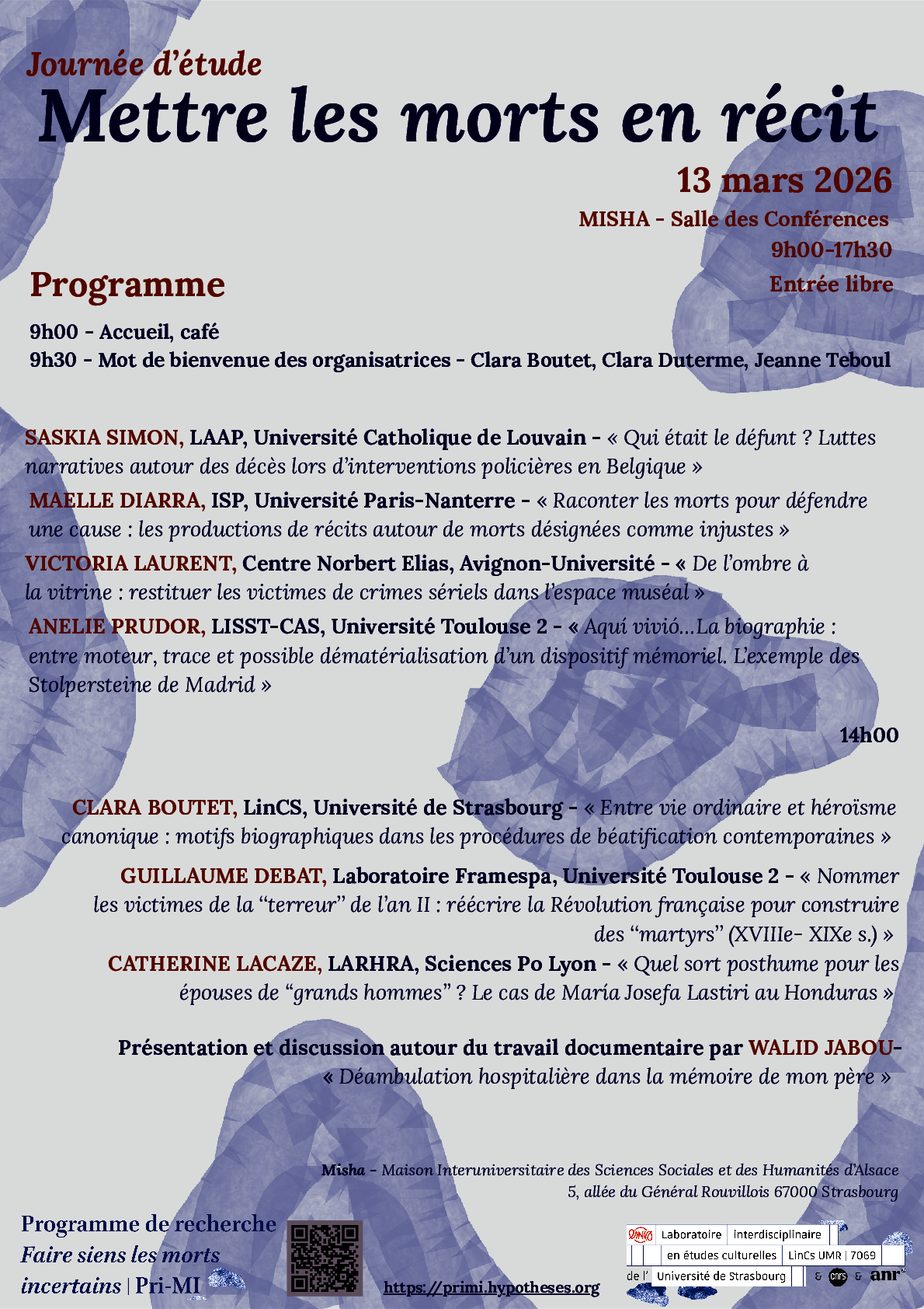 Cette journée d’études vise à explorer une pratique mémorielle particulière : celle de la reconstruction posthume de biographies de défunts, de leur mise en récit et de leur diffusion. Dans les contextes contemporains, nous nous intéresserons aux individus ou aux collectifs qui prennent en charge l’écriture et/ou la narration du récit biographique d’un mort. Si cette entreprise peut être menée par une autorité au titre de sa mission professionnelle (à l’instar d’un enquêteur de police chargé de reconstruire le parcours biographique d’une personne décédée), d’autres individus font ce choix indépendamment de toute fonction ou de tout lien officiel avec le mort dont ils décident de raconter ou d’écrire la vie. C’est sur ces individus qui se font les biographes d’un disparu et sur leurs pratiques que portera la journée ; comment et par qui se construisent les biographies posthumes ? Quels sont les ressorts, les modalités et les enjeux de ces pratiques ?