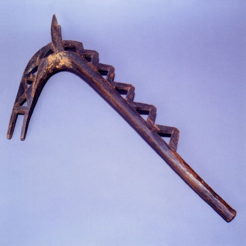 Cette crosse est l’évocation d’une tête de cheval stylisée. Elle est munie d’une paire d’oreilles pointues et se termine par une bouche ouverte. Dans chaque clan, il existe une crosse de voleur. Gardée par le plus vieux, elle est confiée à un jeune pour l’usage rituel. Le gardien de la crosse est appelée yo, tandis que l’on nomme son utilisateur yone ou yona. Tous ces termes signifient « voleur ». C’est ainsi une référence au forgeron qui, grâce au bâton, aurait volé le feu de la forge.