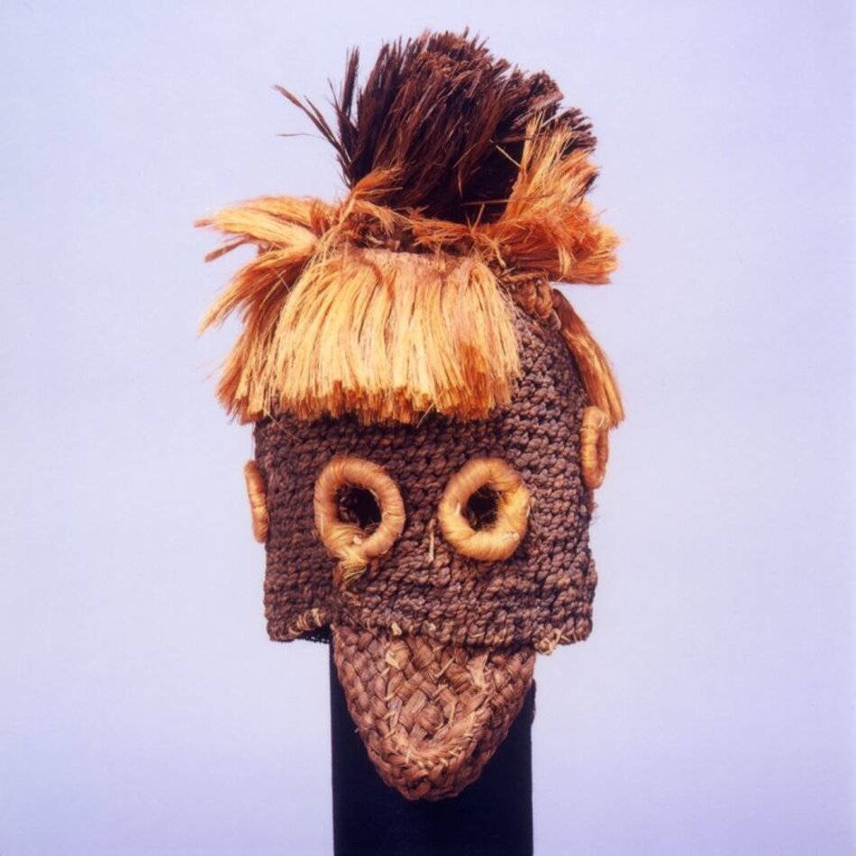 La cagoule noire, bordée d’une frange circulaire de fibres claires au sommet du cimier, est percée de quatre ouvertures ovales devant les yeux ainsi que derrière la tête. Une mentonnière tressée est fixée sur la face et sur la nuque. Une crête de fibres raides orne le sommet de la coiffure.