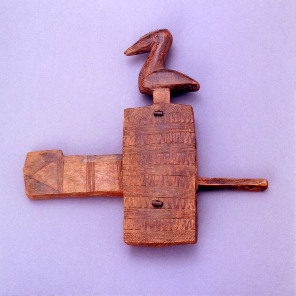 L’oiseau sculpté représente peut-être l’autruche qui, en tant qu’oiseau migrateur, est considéré comme le commissionnaire du hogon (chef spirituel des Dogon). Cette serrure devait servir à la fermeture d’un grenier de hogon, l’oiseau étant le gardien du sanctuaire du Lebé qui relève du culte tenu par le hogon. Mais elle pouvait aussi bien se trouver sur le grenier d’une femme seule, vivant du commerce des arachides – que l’autruche peut ramener en période de sécheresse. La simplicité du pêne et l’absence de partie basse accréditent plutôt la seconde hypothèse.